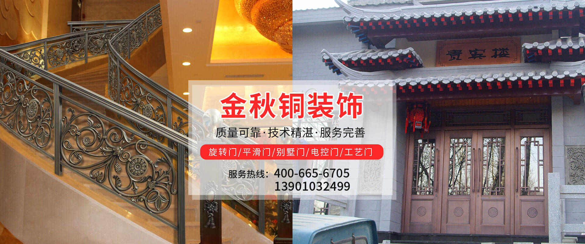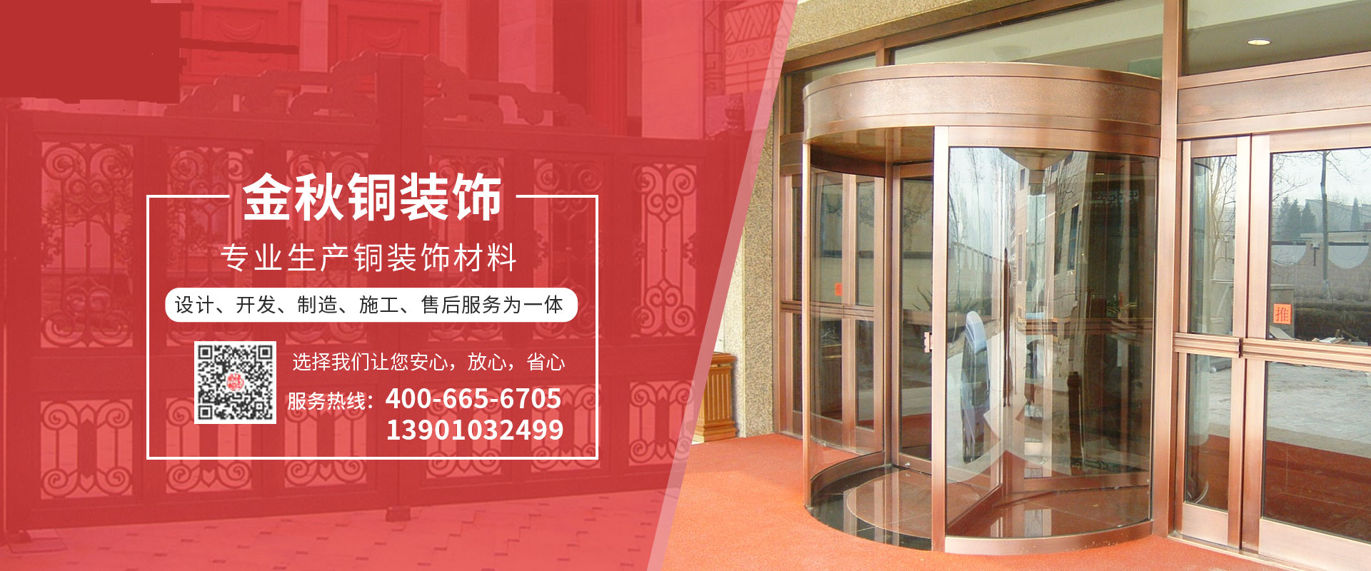 北京金秋銅裝飾材料有限公司是專業(yè)生產(chǎn)銅裝飾材料及設(shè)計、開發(fā)、制造、施工、售后服務(wù)為一體的大型綜合企業(yè)。可承接建筑銅裝飾工程及五星級酒店、別墅、博物館、樓樘管所等高檔銅裝飾項目;生產(chǎn)各種規(guī)格的旋轉(zhuǎn)門、平滑門、別墅門、電控門、工藝門、旋轉(zhuǎn)護欄、屋頂銅飾防水瓦、浮雕壁畫......